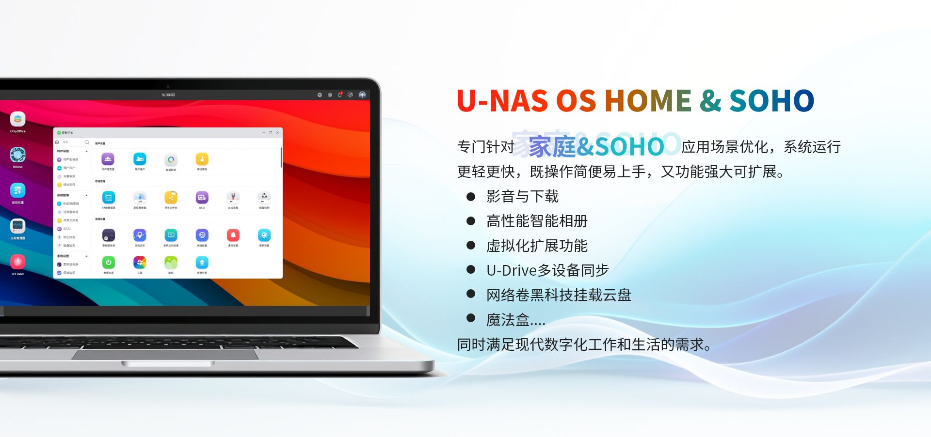 基于萬由U-NAS OS 體系的存儲、備份、私有云服務的一體化平臺,為企業(yè)提供一套安全、高性能、彈性可擴展的一體化數(shù)據(jù)統(tǒng)一管理、主動備份和數(shù)據(jù)在不同地區(qū)、不同設備同步的解決方案。并提供個性化的定制服務,使企業(yè)的TOC(總體擁有成本)最低